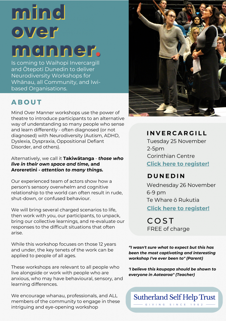 Mind Over Manner have been generously funded by The Sutherland Self Help Trust to bring community workshops to 5 areas in Waihōpai ( Invercargill)